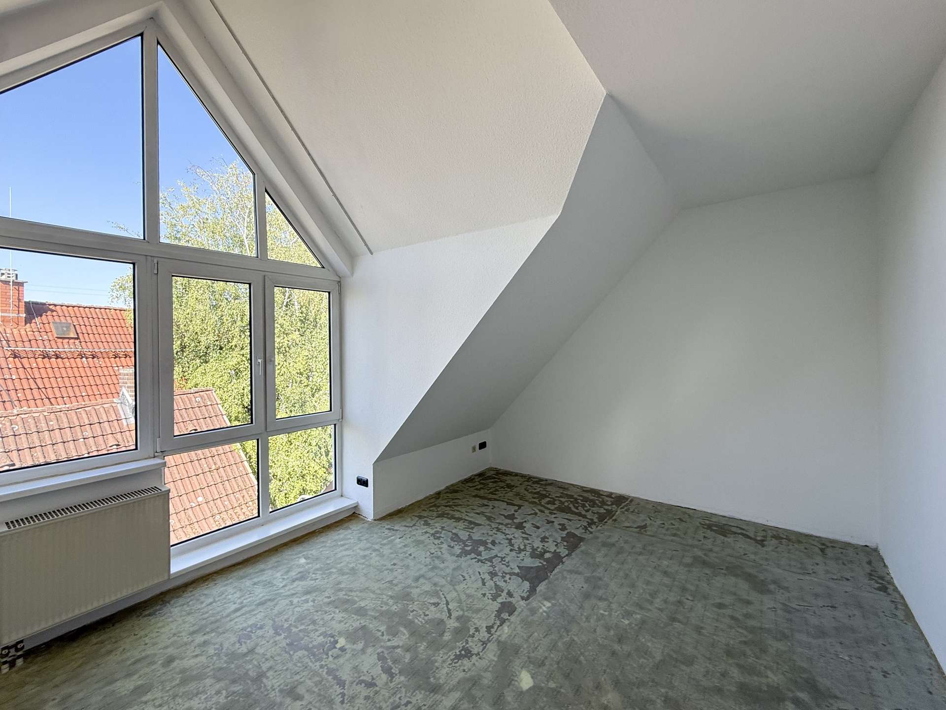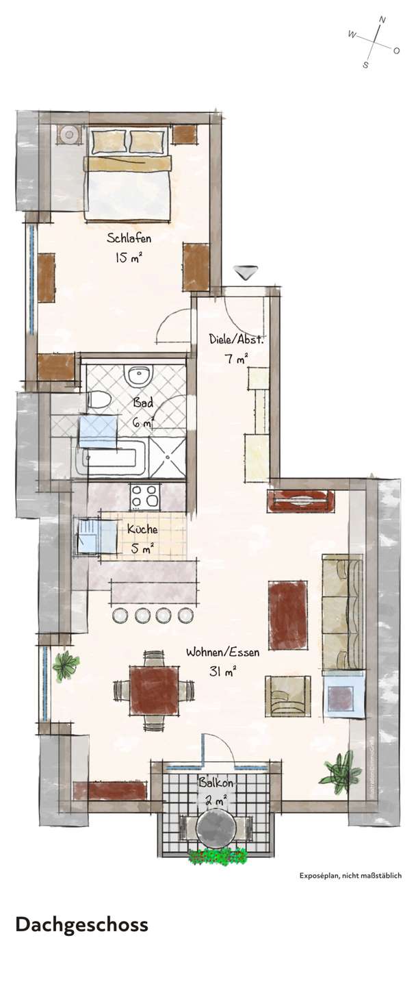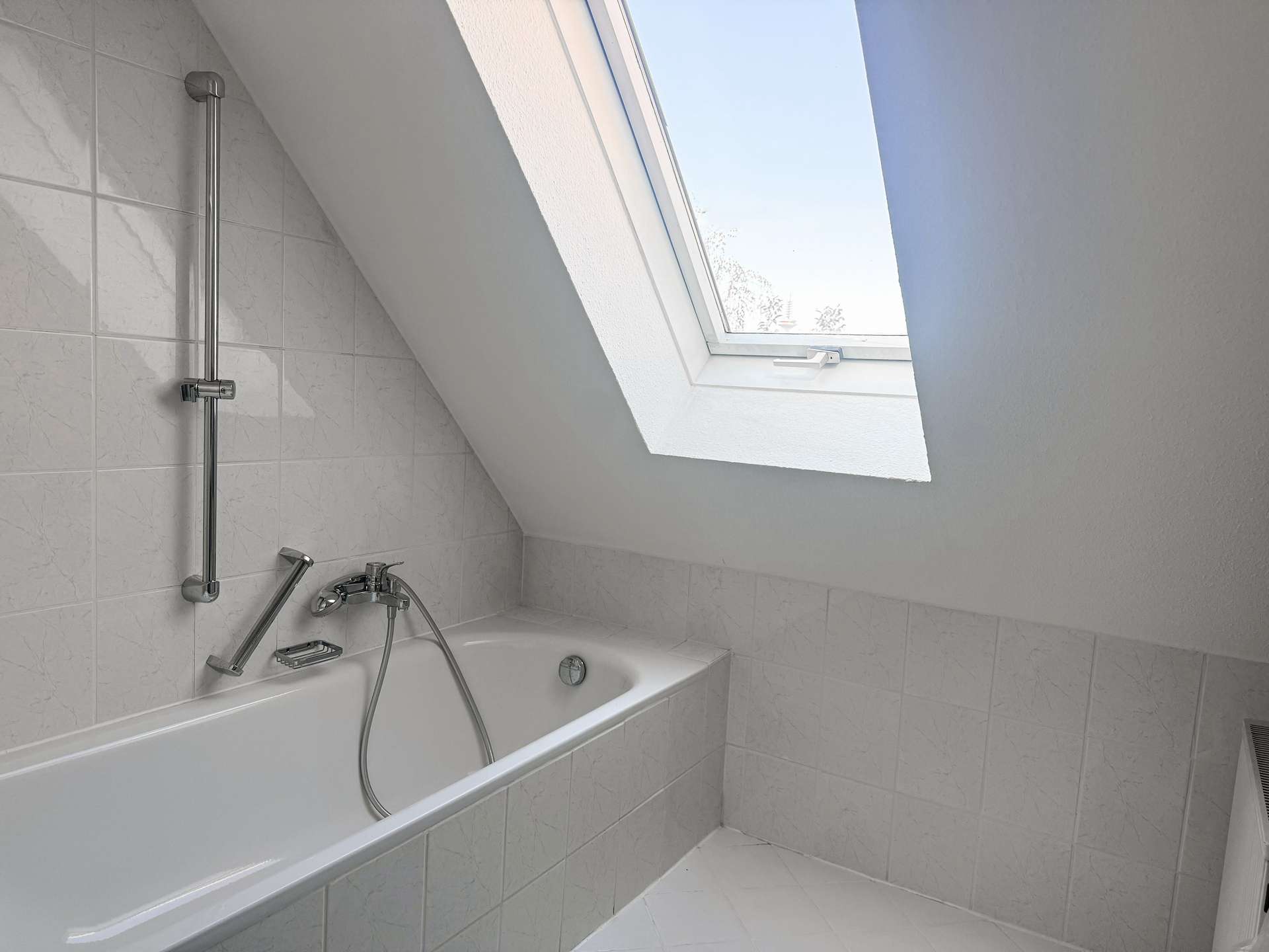 Die Wohnung selbst bietet auf ca. 64 m² eine freundliche, helle Atmosphäre mit Dachschrägen und Raumhöhen bis zu 3,50 m. Der Wohn- und Essbereich führt direkt auf den sonnigen Südbalkon mit herrlichem Blick über Dächer und in die Baumkronen. Ein Tageslichtbad rundet das attraktive Gesamtbild ab.