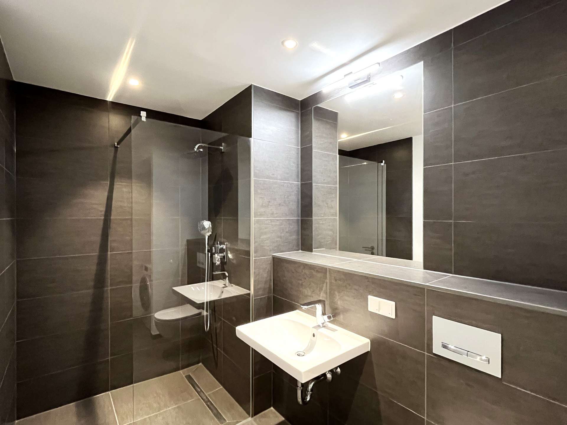 - Ein stilvolles Badezimmer mit Dusche und Handtuchtrockenheizkörper