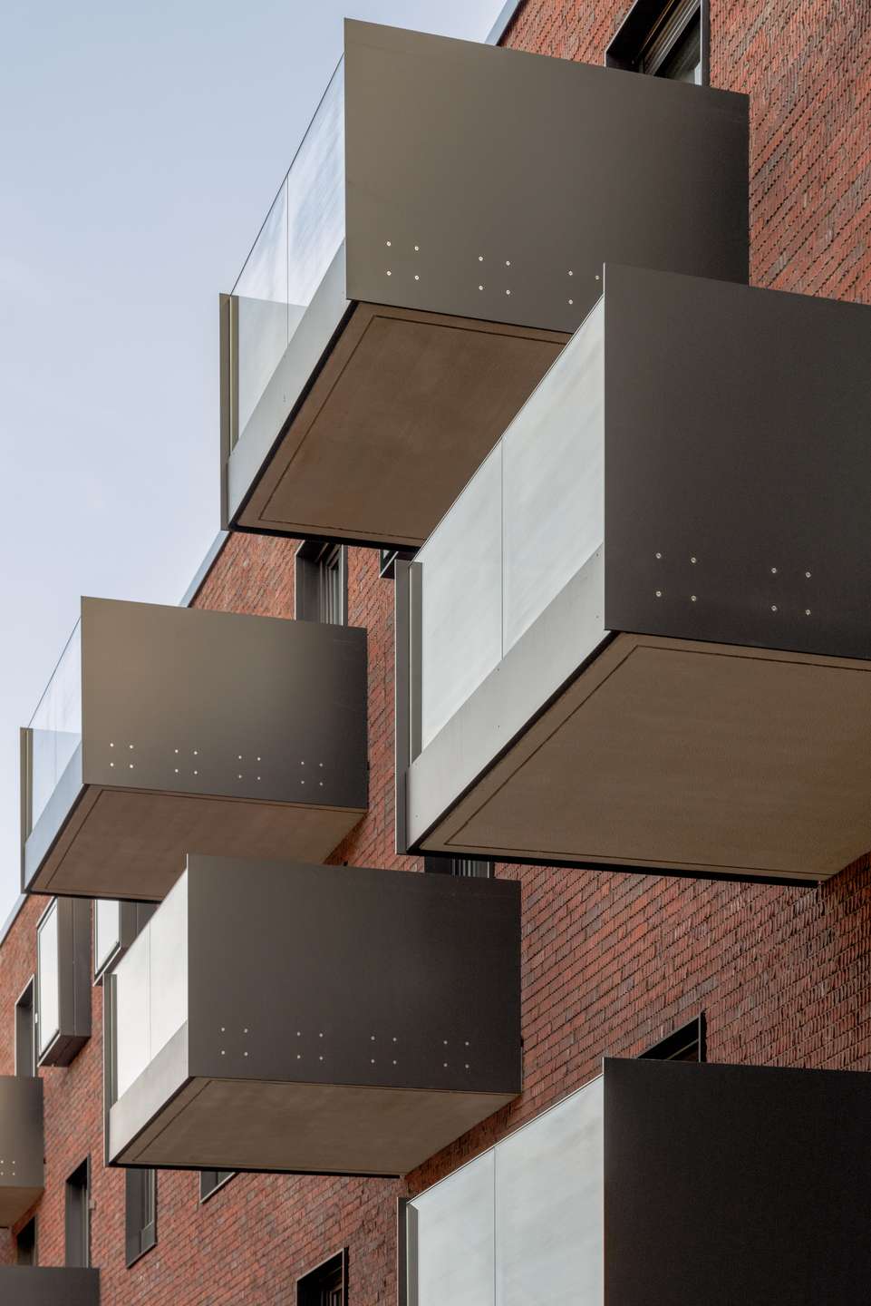 Durchdachte Architektur trifft auf zeitloses Design: Balkone, Loggien und Terrassen ermöglichen den direkten Blick aufs Wasser. Die hochwertige Backsteinfassade, nachhaltige Bauweise mit Fernwärme und begrünte Dächer schaffen ein Zuhause mit Charakter.