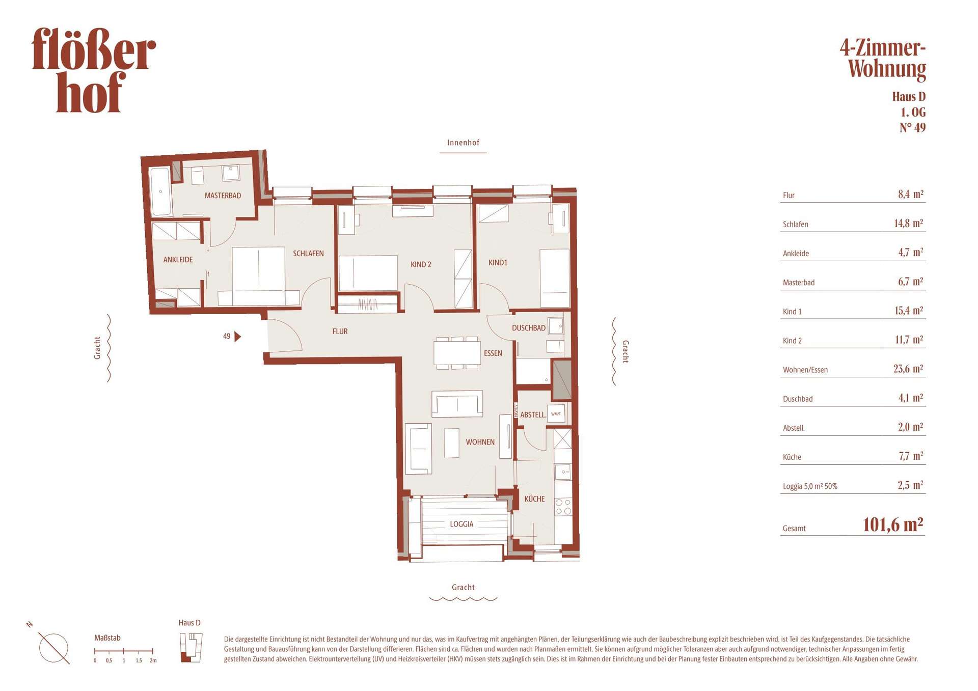 Mit 92 Wohneinheiten – vom smarten Studio bis zum großzügigen Hafenhaus – bietet der Flößerhof Wohnraum für Singles, Paare und Familien. 14 Wohnungen sind barrierefrei, neun rollstuhlgerecht, und jede Einheit verfügt über eine private Außenfläche. Eine verkehrsfreie Umgebung mit Tiefgarage und Fahrradstellplätzen verbindet urbanen Komfort mit einzigartiger Lage am Wasser.