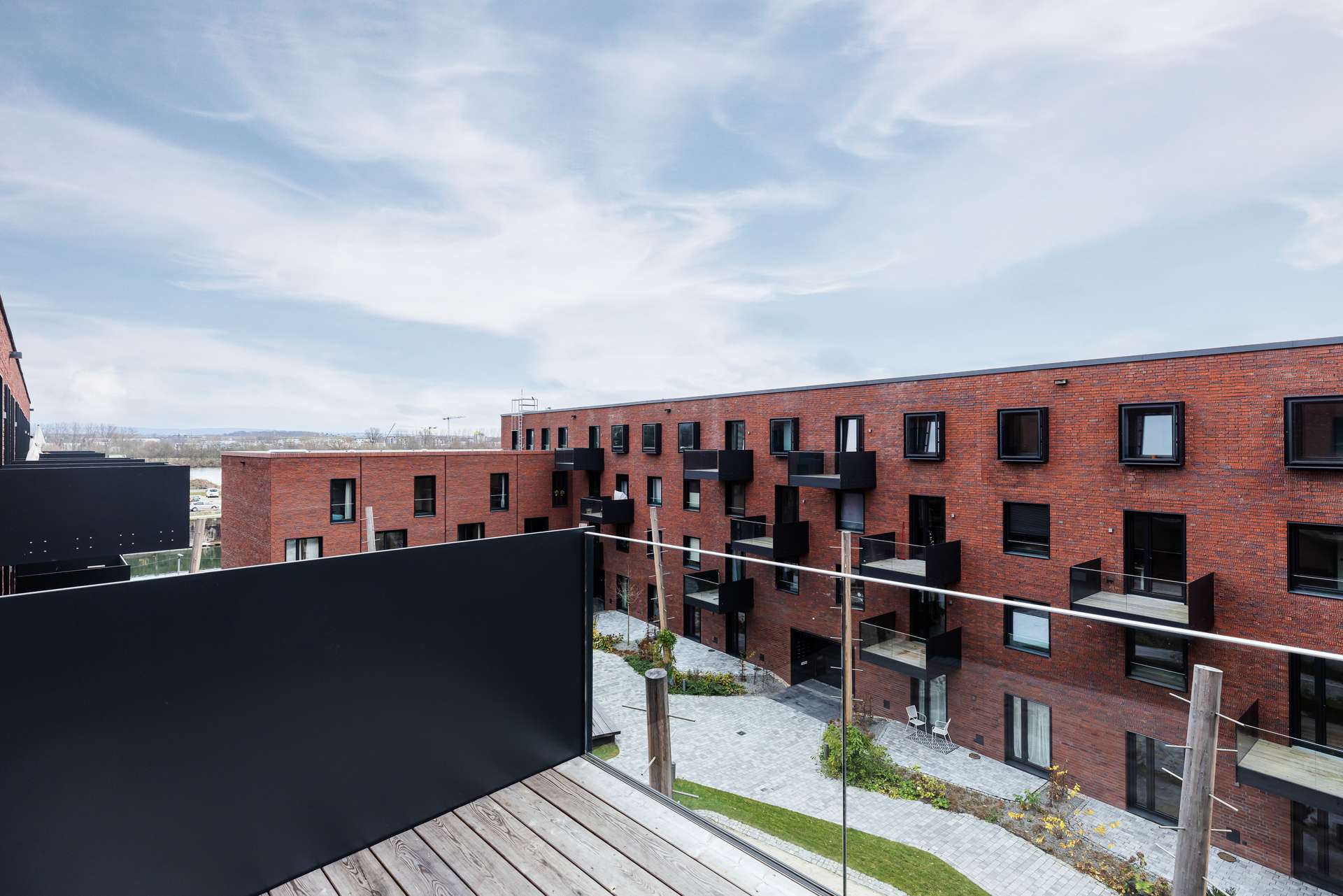 Durchdachte Architektur trifft auf zeitloses Design: Balkone, Loggien und Terrassen ermöglichen den direkten Blick aufs Wasser. Die hochwertige Backsteinfassade, nachhaltige Bauweise mit Fernwärme und begrünte Dächer schaffen ein Zuhause mit Charakter.