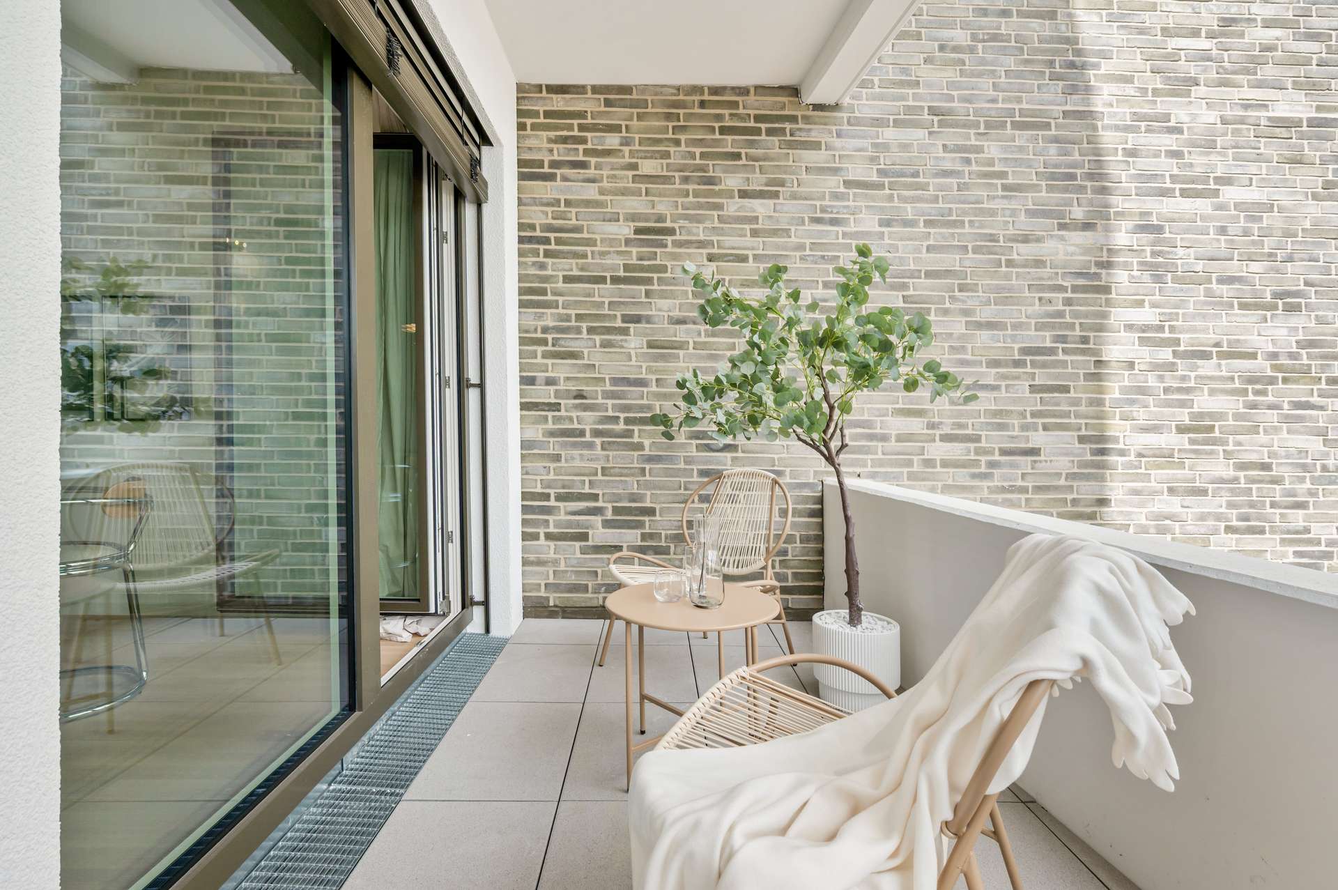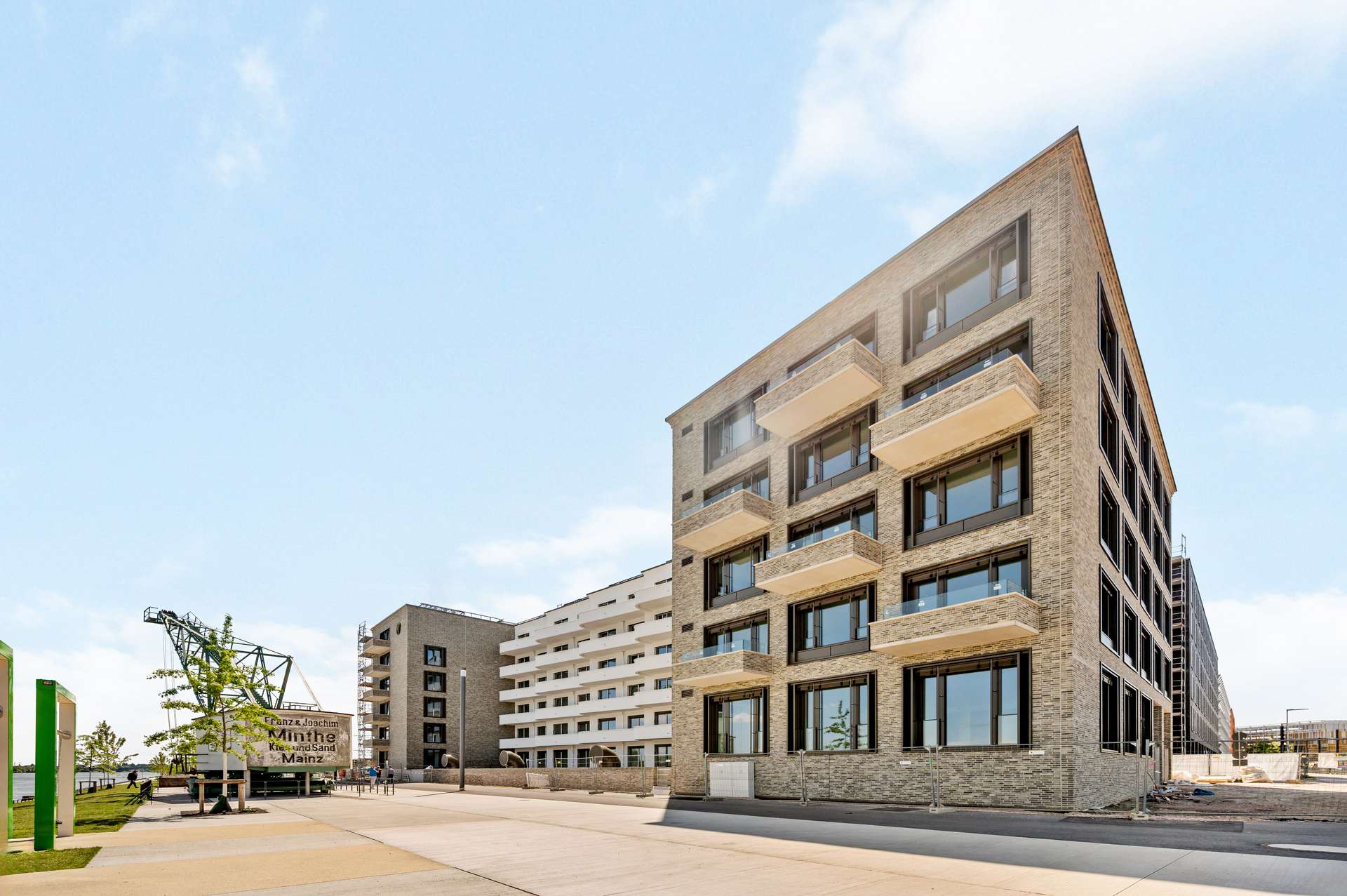 Geplant vom renommierten Büro happarchitecture, spiegelt das Ensemble mit seiner offenen, fließenden Form die Nähe zum Wasser wider. Graugrüner Klinker, weiße Putzfassaden und wellenförmig gestaltete Balkone verleihen Havn einen markanten, modernen Charakter. Der begrünte Innenhof und der gemeinschaftliche Dachgarten mit Rheinblick bieten Raum für Rückzug, Begegnung und Erholung – mitten in der Stadt.