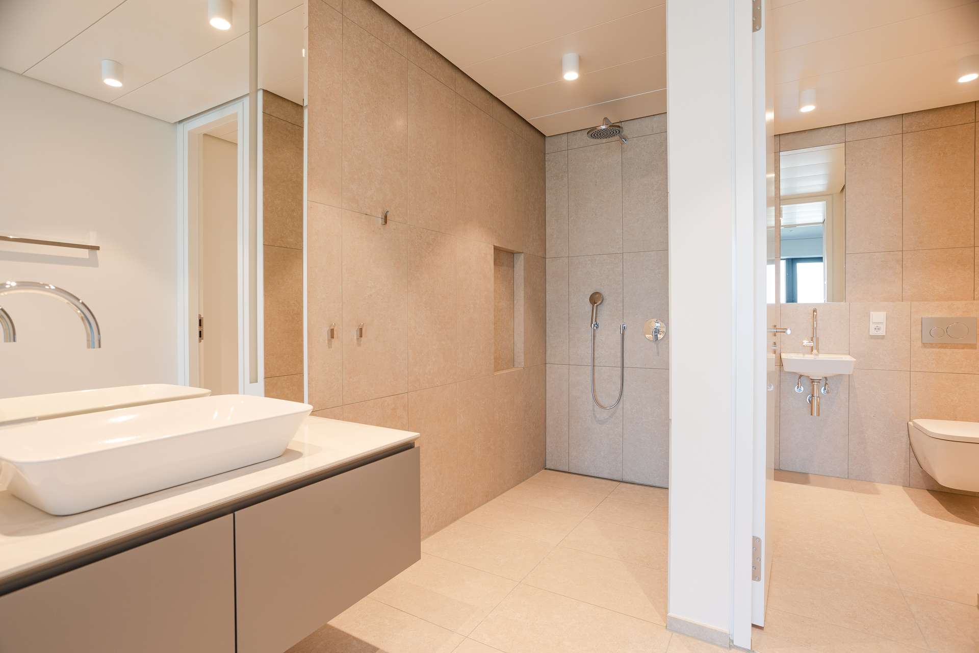 - En-suite Badezimmer mit Walk-In-Dusche, Waschtischunterschrank, beleuchtetem Spiegel und hochwertigen Bad-Armaturen