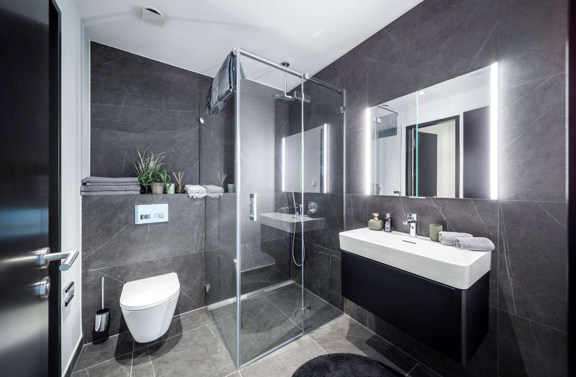 - Design-Duschbad mit verchromtem Handtuchheizkörper & bodengleicher Dusche