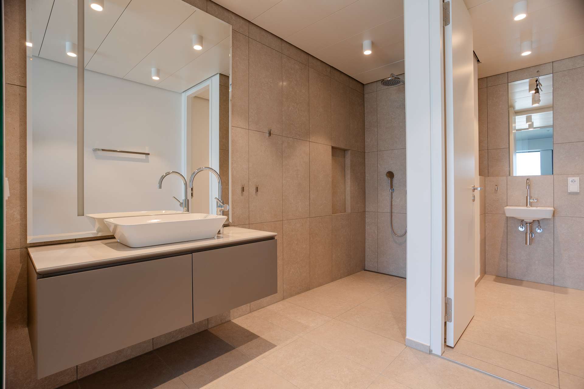- En-Suite Badezimmer mit Walk-In-Dusche, Waschtischunterschrank, beleuchtetem Spiegel und hochwertigen Bad-Armaturen