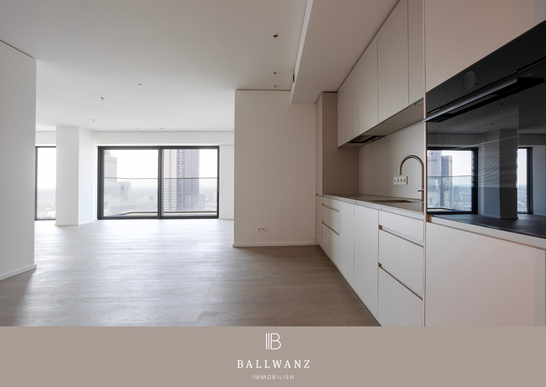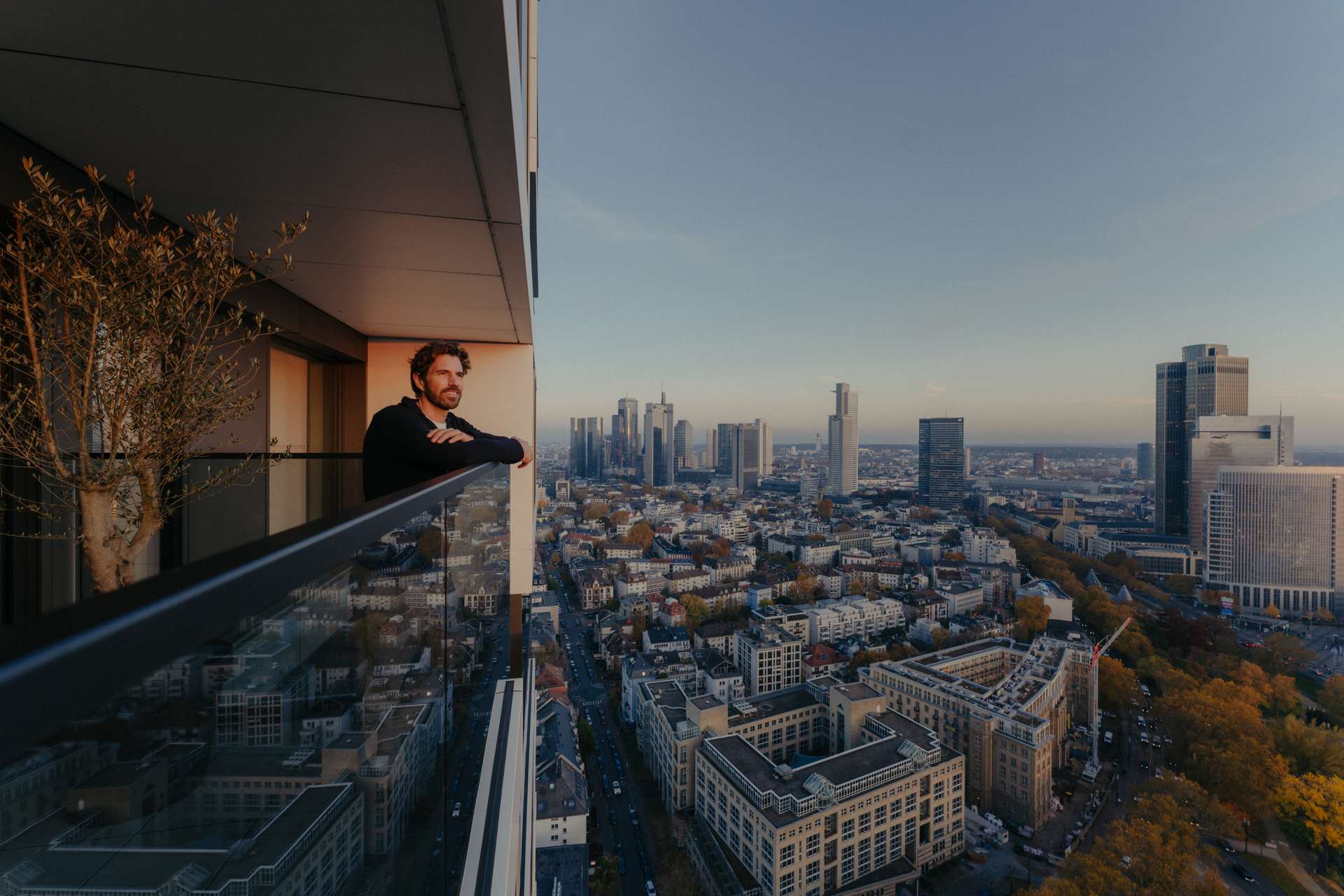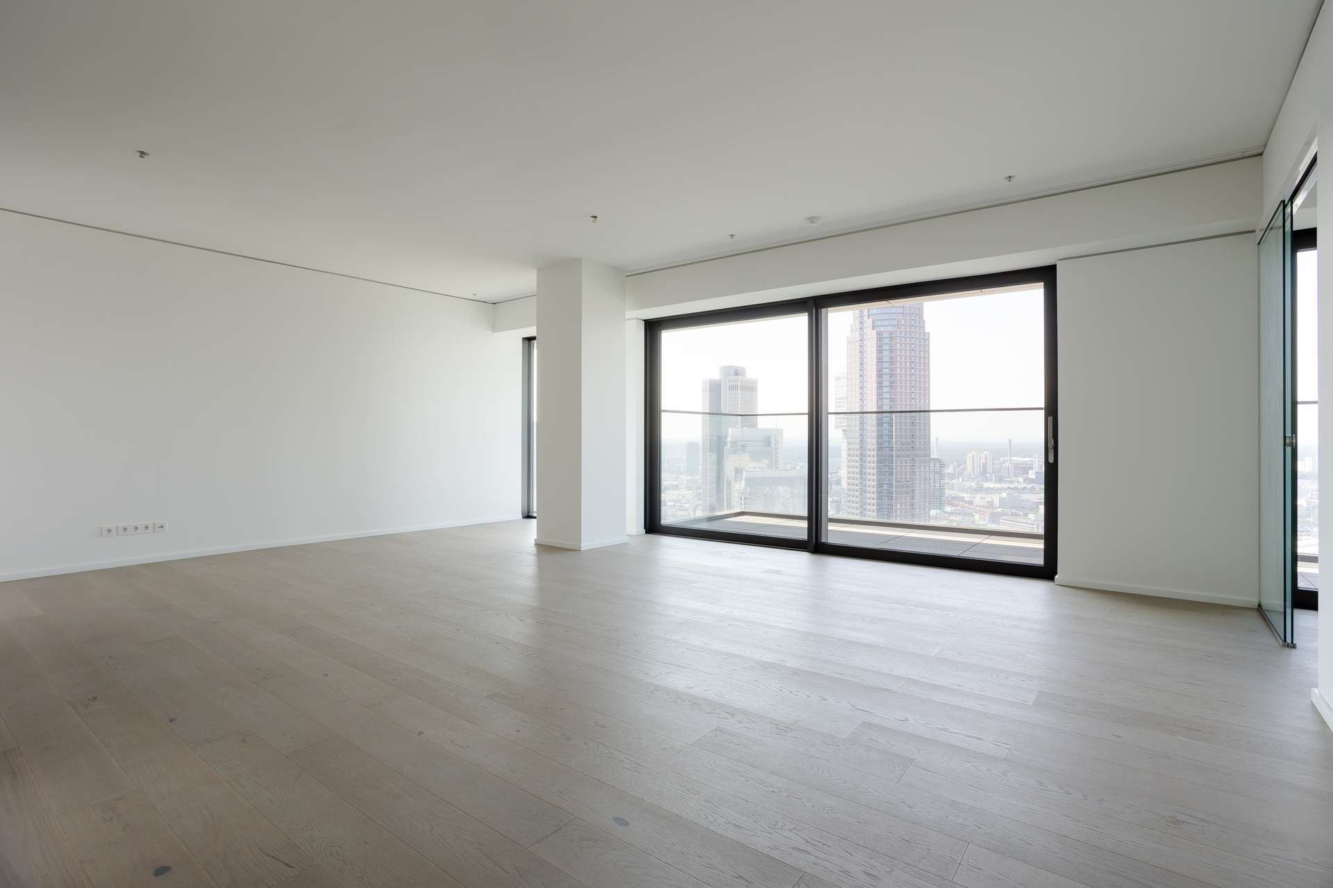 - Verglaster Außenbereich mit unverbautem Ausblick auf die Skyline und Messe