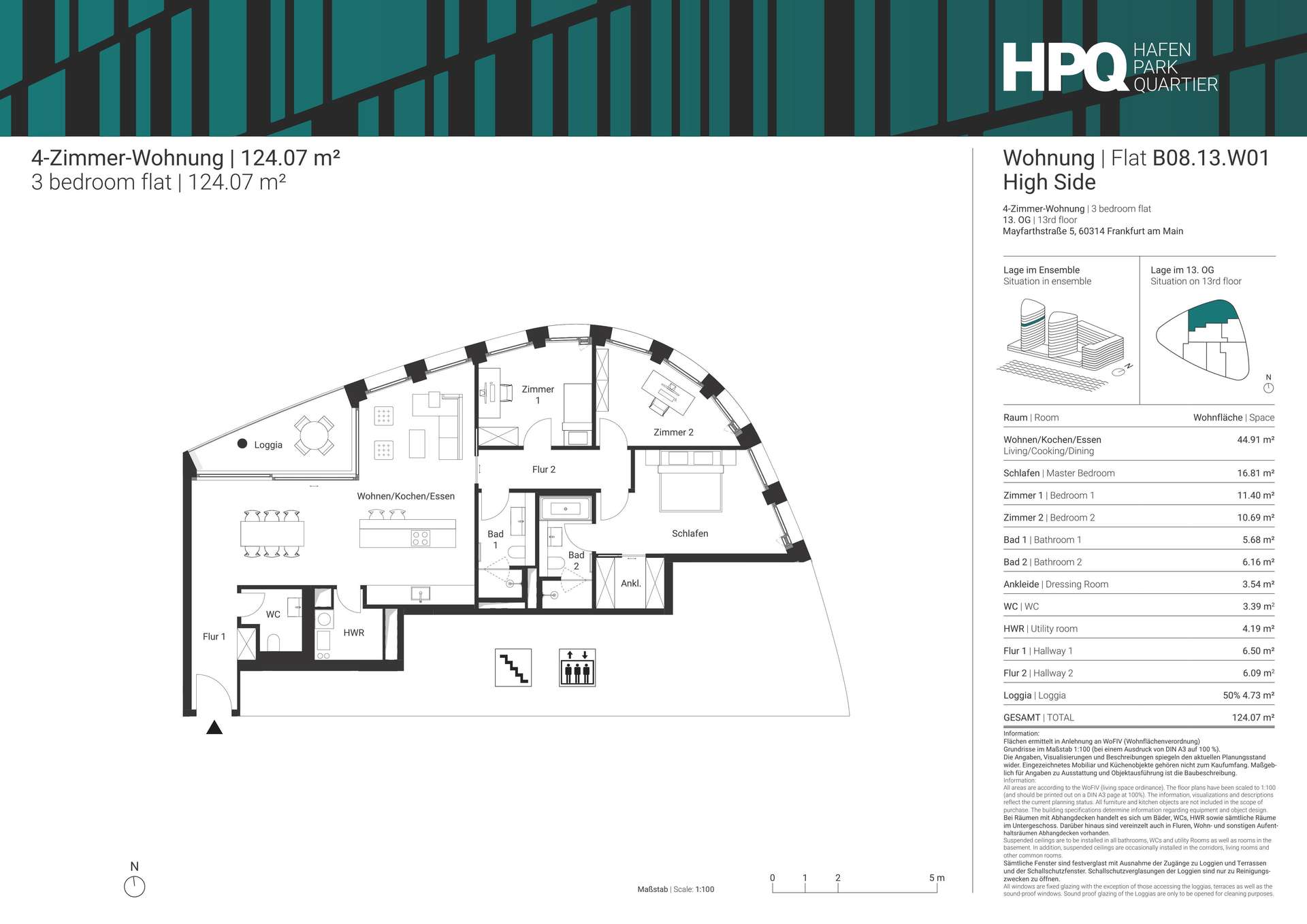 Den Höhepunkt des neuen Quartiers bilden die beiden markanten, 52 und 58 Meter hohen Türme des HPQ Living-Ensembles. Die angebotene Wohnung befindet sich im höheren der beiden Türme im 13. Obergeschoss. Mit Ihrem großzügigen Wohn- und Essbereich - kombiniert mit einer offenen Küche, mit der Möglichkeit eine Kochinsel zu installieren - beeindruckt sie bereits beim Betreten. Der mit einer Schiebetür abgetrennte private Bereich, bietet mit 3 Schlafzimmer, eines davon mit Ankleide und En-suite-Badezimmer, sowie einem weiteren Duschbad, Raum für ruhige Stunden. Die Fassaden der Türme glänzen mit einer exklusiven, bronzefarbenen Aluminiumverkleidung, die bei Sonneneinstrahlung besonders beeindruckend wirkt.