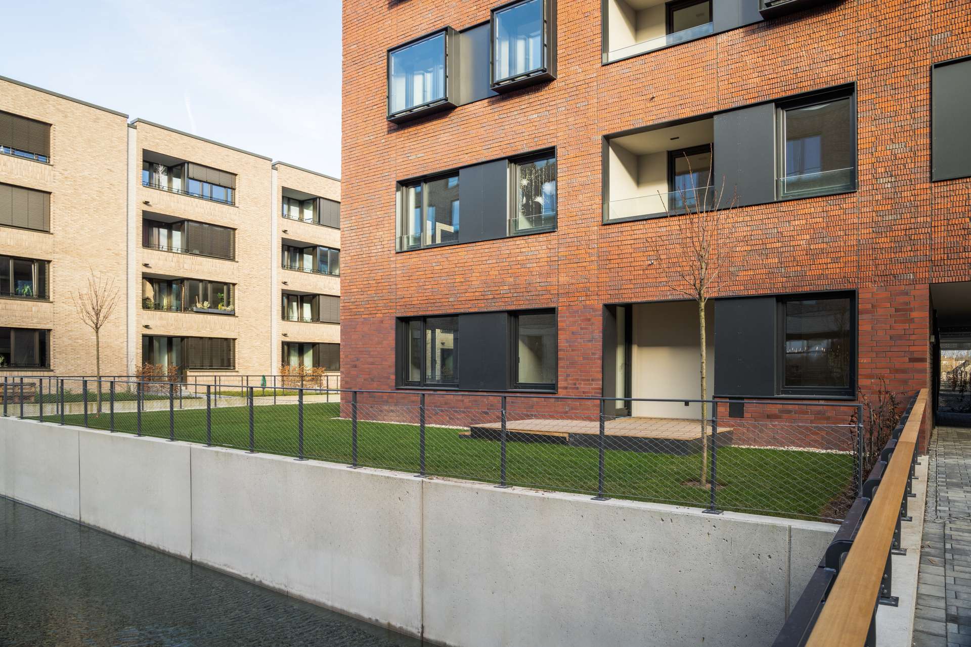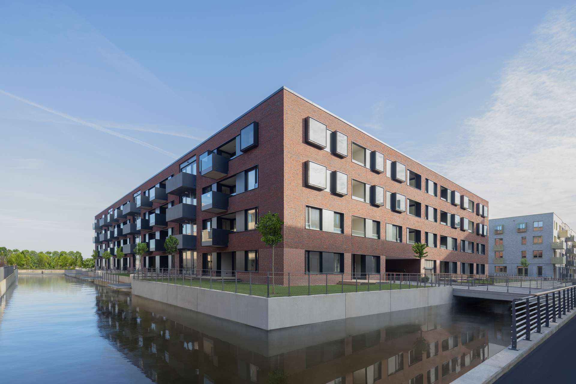 Durchdachte Architektur trifft auf zeitloses Design: Balkone, Loggien und Terrassen ermöglichen den direkten Blick aufs Wasser. Die hochwertige Backsteinfassade, nachhaltige Bauweise mit Fernwärme und begrünte Dächer schaffen ein Zuhause mit Charakter.