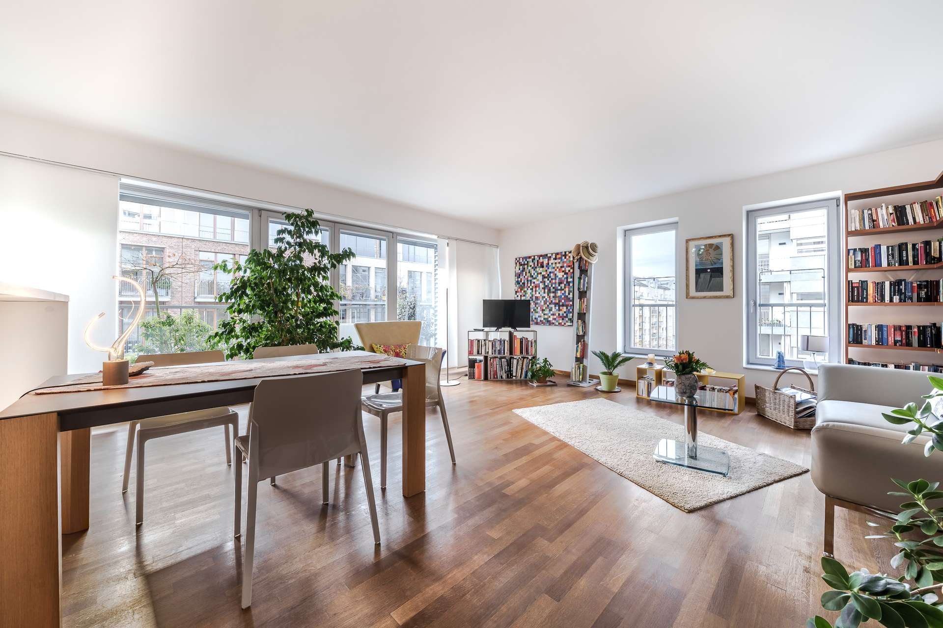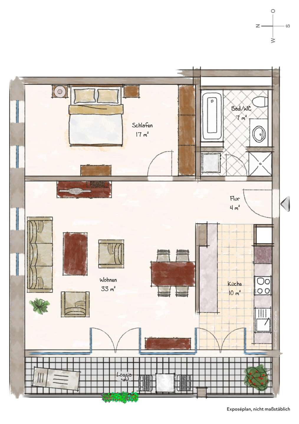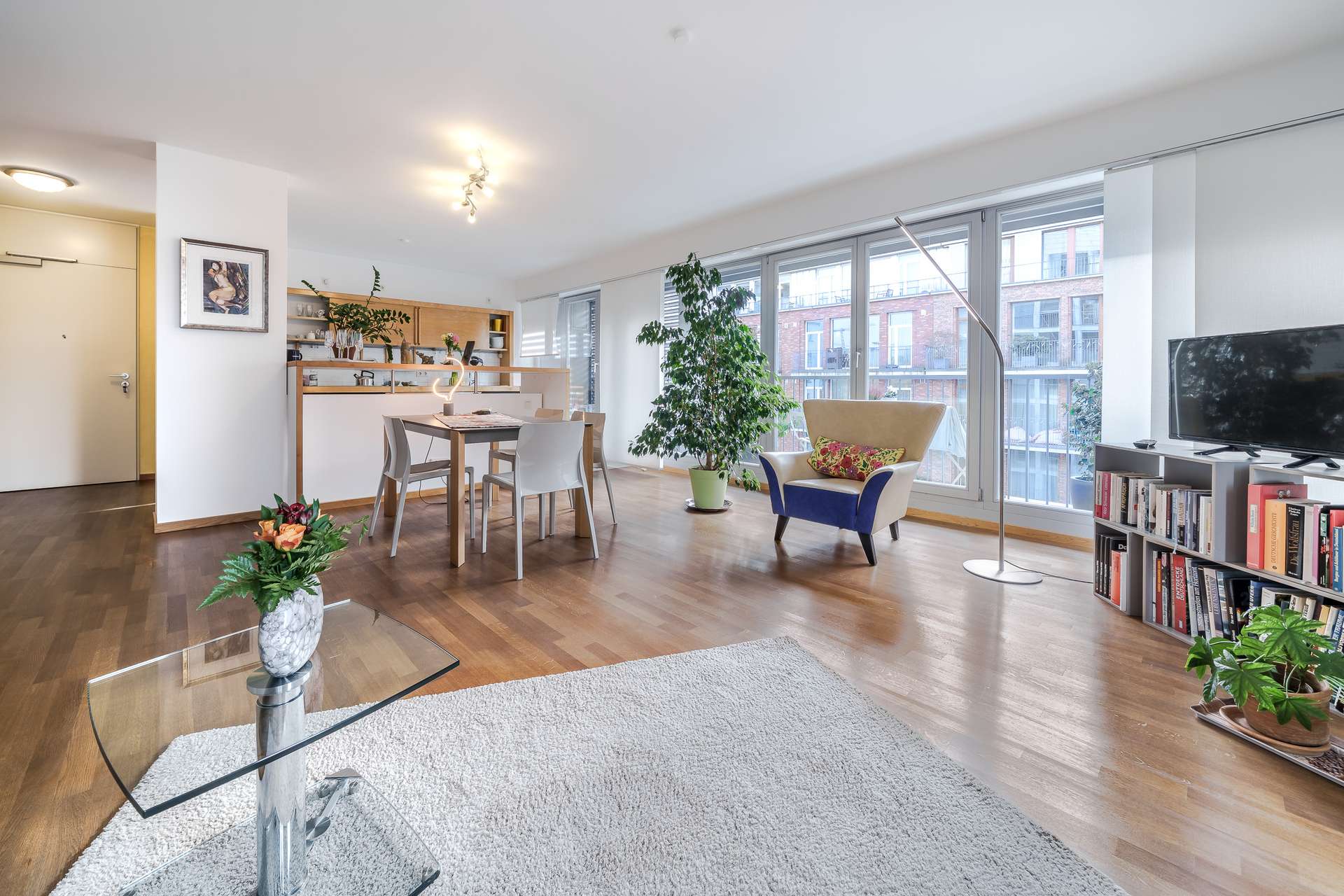 Diese attraktive Wohnung im 5. Obergeschoss überzeugt durch einen großzügigen Wohn-/Essbereich mit integrierter Küche und Zugang zur sonnigen West-Loggia. Bodentiefe Fenster, Echtholzparkett und Fußbodenheizung sorgen in allen Räumen für ein modernes, wertiges Wohnambiente.