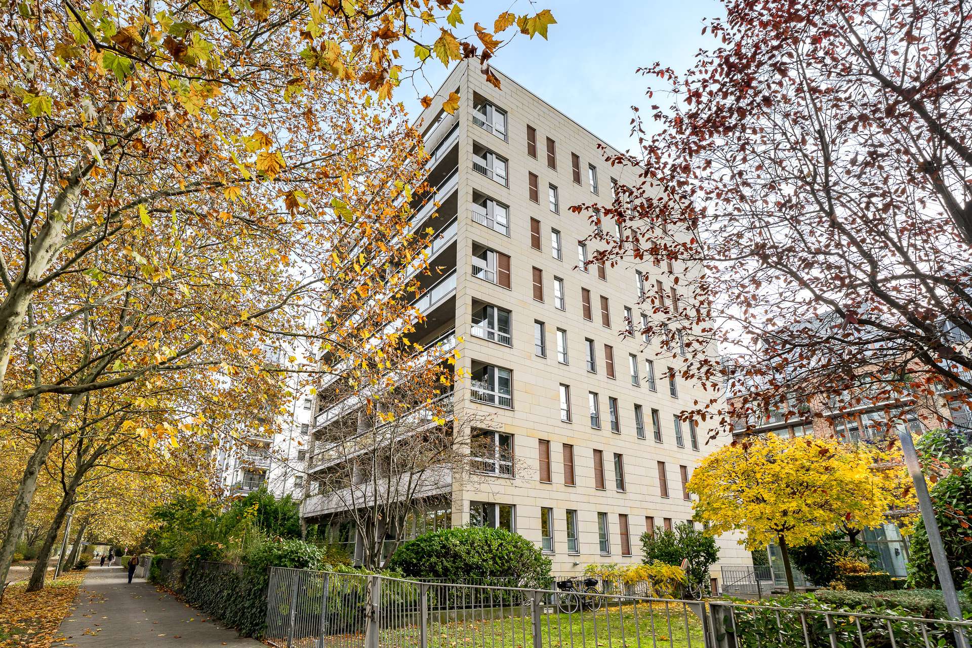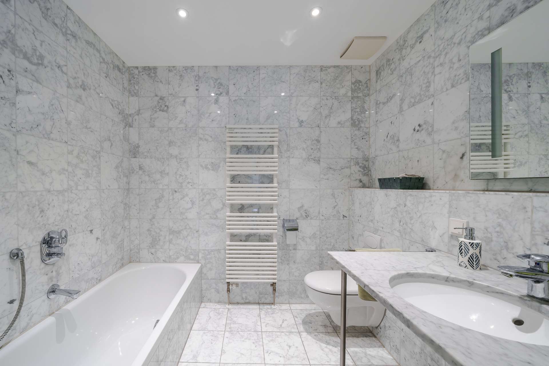 Das helle Schlafzimmer mit seitlichem Mainblick ist mit einem maßgefertigten Einbauschrank ausgestattet. Das großzügige Bad verfügt sowohl über eine Badewanne als auch eine Dusche und bietet zudem Platz für Waschmaschine und Trockner.