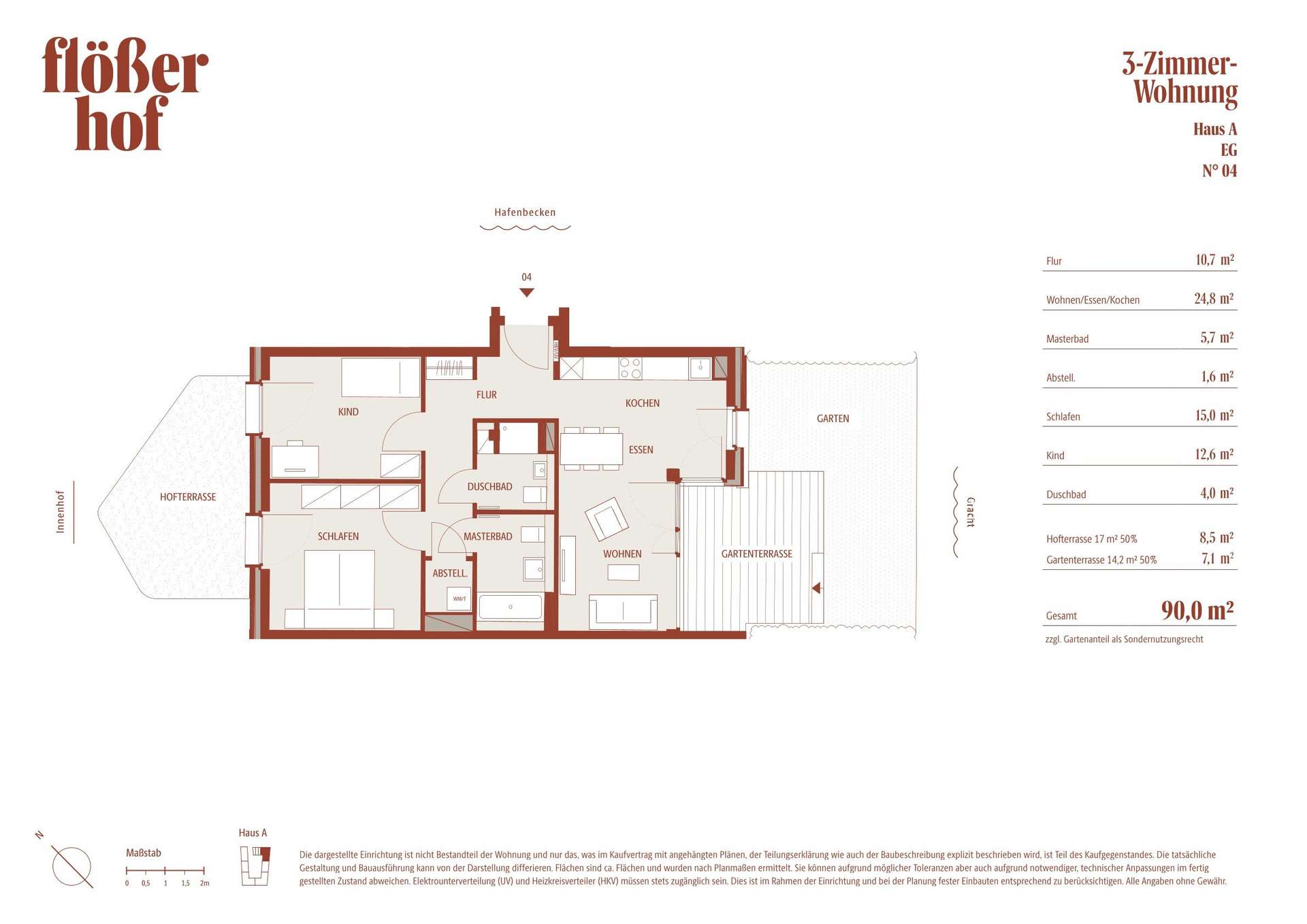Mit 92 Wohneinheiten – vom smarten Studio bis zum großzügigen Hafenhaus – bietet der Flößerhof Wohnraum für Singles, Paare und Familien. 14 Wohnungen sind barrierefrei, neun rollstuhlgerecht, und jede Einheit verfügt über eine private Außenfläche. Eine verkehrsfreie Umgebung mit Tiefgarage und Fahrradstellplätzen verbindet urbanen Komfort mit einzigartiger Lage am Wasser.