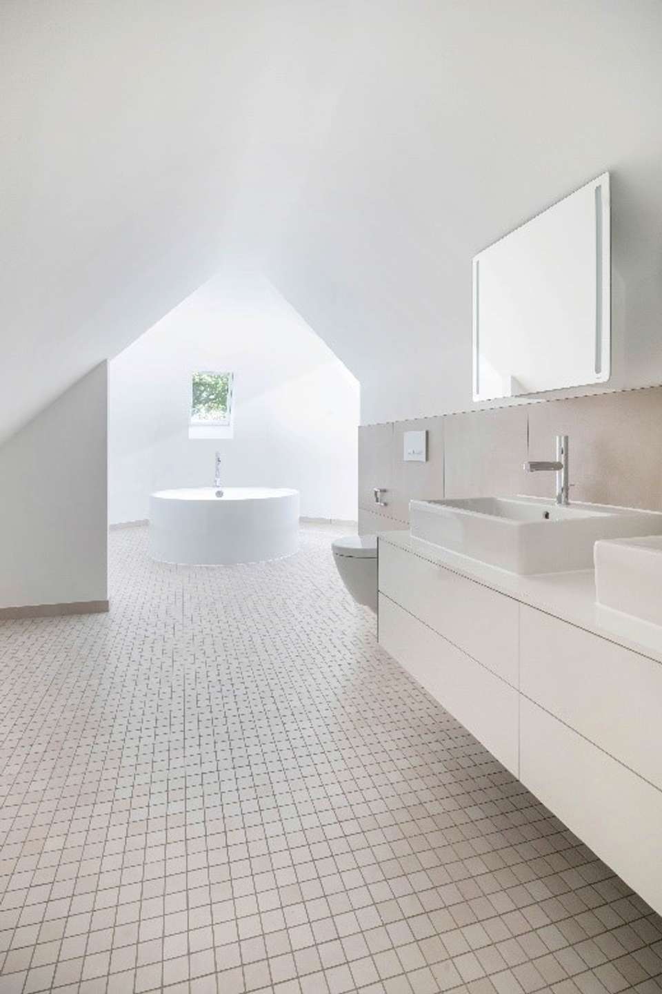- Außergewöhnliches Bad im Kuppelgewölbe mit freistehender Badewanne, Doppelwaschbecken- und Unterschrank sowie Spiegel mit Beleuchtung