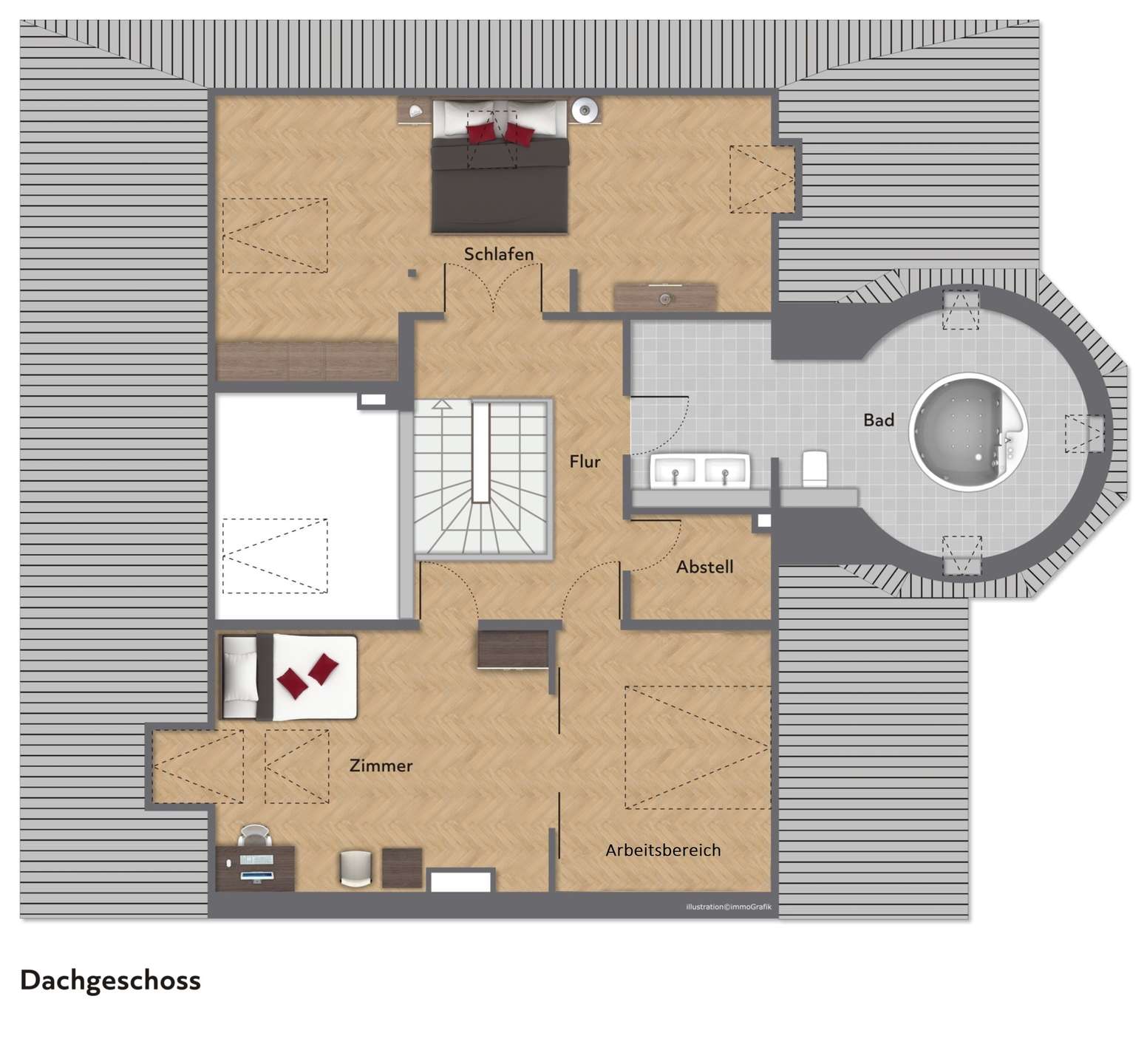 - Die Gesamtwohnfläche wird durch die Dachschrägen auf ca. 116 m² berechnet